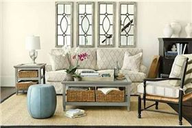 亚麻沙发、白色的花园座椅和草黄色天然纤维地毯,整体感觉比较协调。