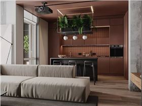 第一个居室拥有舒适的空间基调。棕土色在墙上拥有巨大的块面,并在顶上延伸。白色的墙壁、混凝土顶棚、木饰面与黑色构件件结合在一起,营造出大胆而自信的空间。