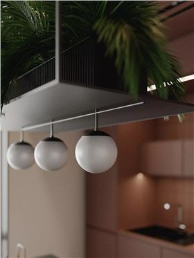 悬挂在厨房岛上的架子具有良好的装饰功能。顶部的花盆上长满了浓密的树叶,给房间增添了无限生机,同时与旁边的墙上及顶上的棕土色块面形成和谐的调和。下方还挂着三盏可爱的球形磨砂灯。