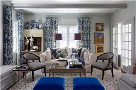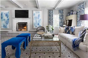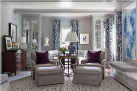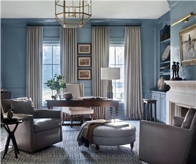 蓝色系是色彩搭配中最常见到的组合典型。如果喜欢被蓝色包裹的感觉,你不妨尝试这种由大面积的蓝色加持再以小部分亮色点缀的形式。配套的窗帘可以是跳跃性的、让人心动的英伦古典红,也可以搭配雪白的、纤尘不染的棉麻质地,同样地,具有绅士味道的高级灰色系窗帘更加充满迷人魅力。