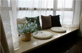 卧室飘窗窗帘效果图:两个榻榻米圆垫子,喝茶下棋聊天都有了好去处。与客厅其他地方相比,这里不但通风采光一流,还可以放眼外面的世界,何乐而不为。